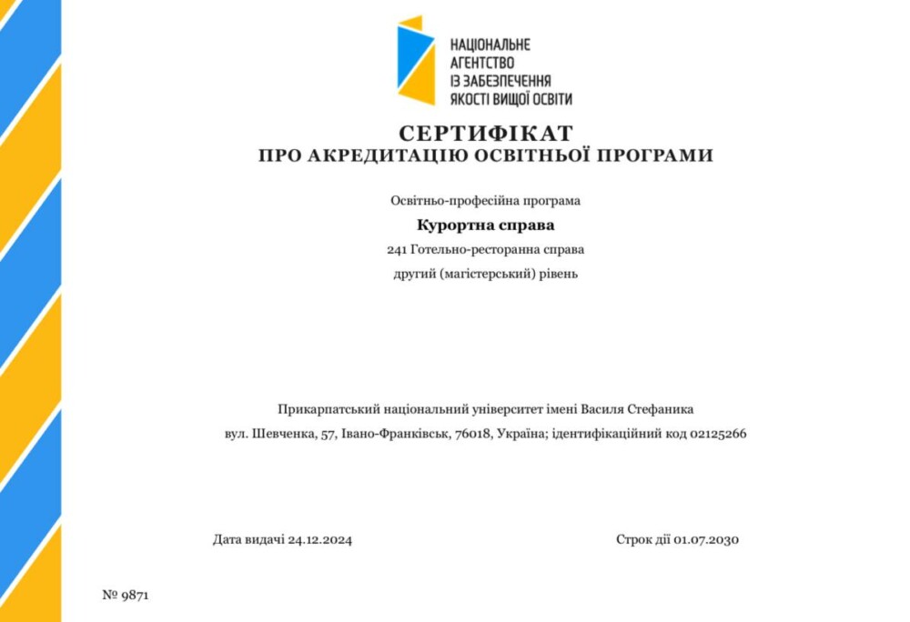 24 грудня на черговому засіданні Національного агентства із забезпечення якості вищої освіти було прийняте остаточне рішення про акредитацію нашої освітньої програми «Курортна справа» другого (магістерського) рівня вищої освіти за спеціальністю 241 Готельно-ресторанна справа. Позитивне рішення про акредитацію було підтримане і членами експертної групи, і членами галузевої експертної ради, і радою Національного агентства із забезпечення якості вищої освіти! Це ще раз підкреслює високий рівень викладання, ефективність комунікацій зі стейкхолдерами, прозорість взаємодії зі студентами, хорошу роботу керівництва університету.